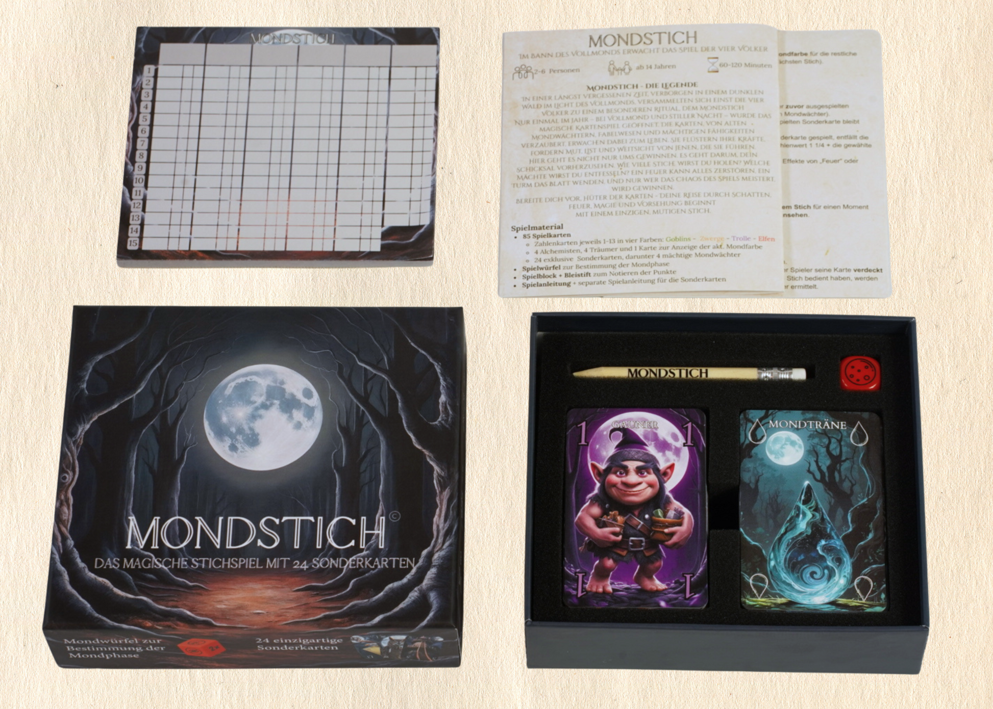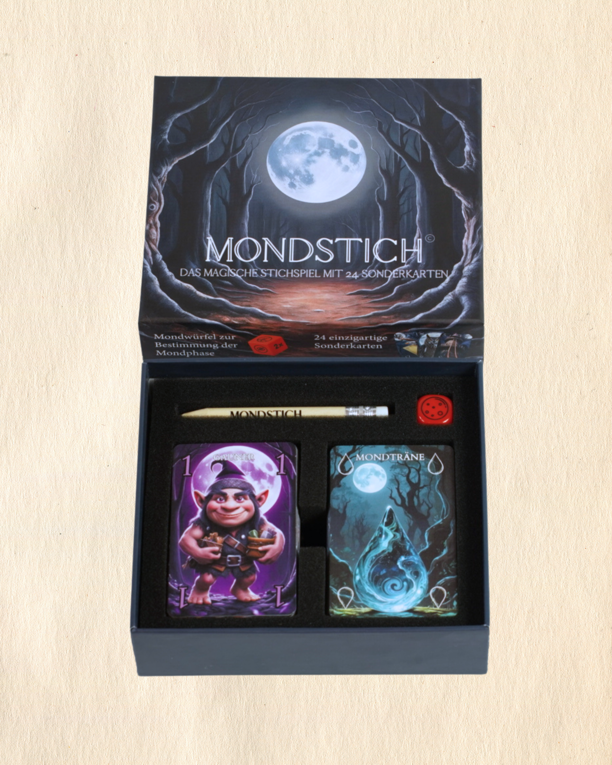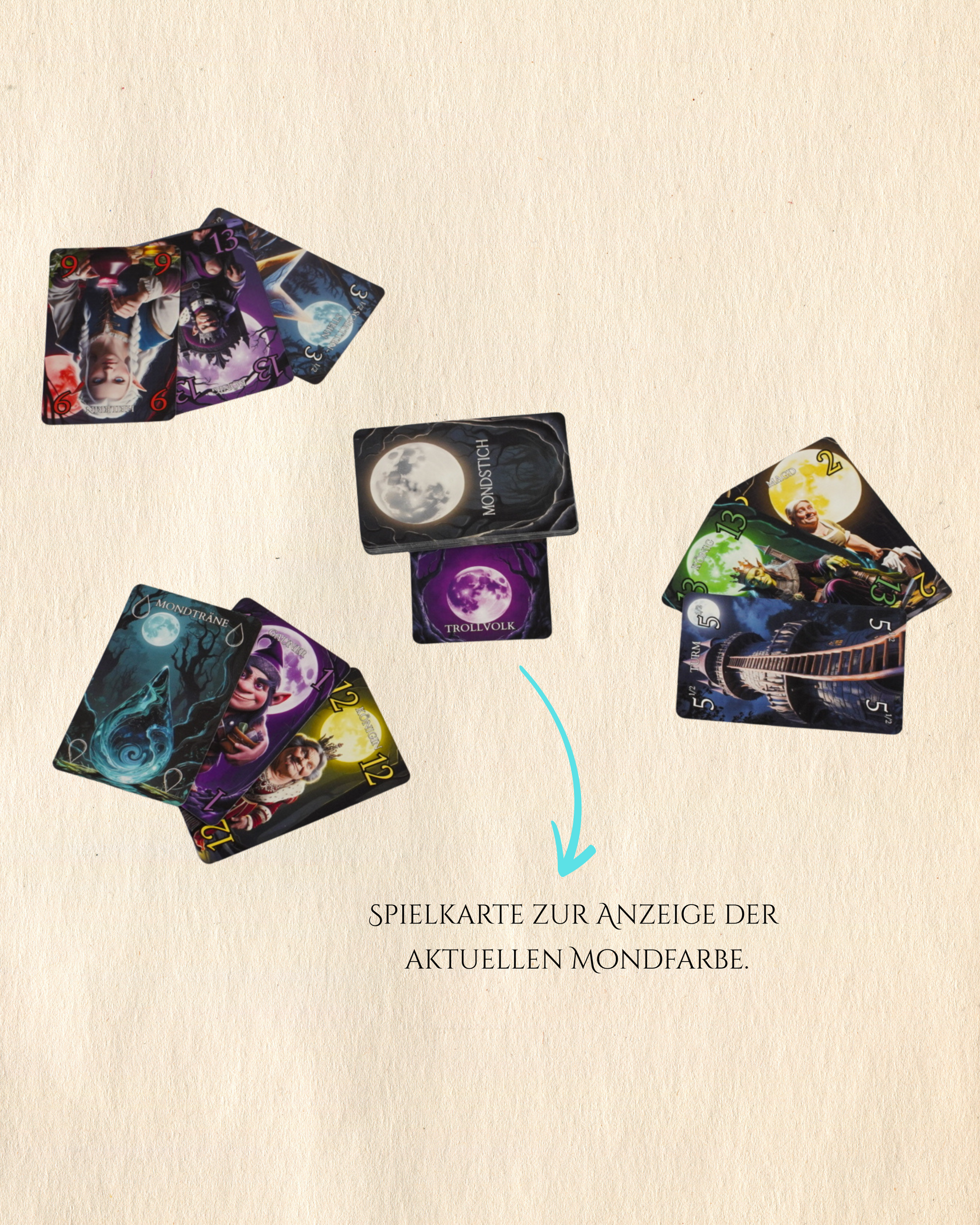Mit 24 mächtigen Sonderkarten – gestaltet mit Liebe zum Detail und inspiriert von alten Legenden – entfesselst du Mondwächter, starke Mächte und überraschende Wendungen. Jede Partie fordert Mut, Taktik und ein Gespür für dein Schicksal: Wie viele Stiche wirst du holen?