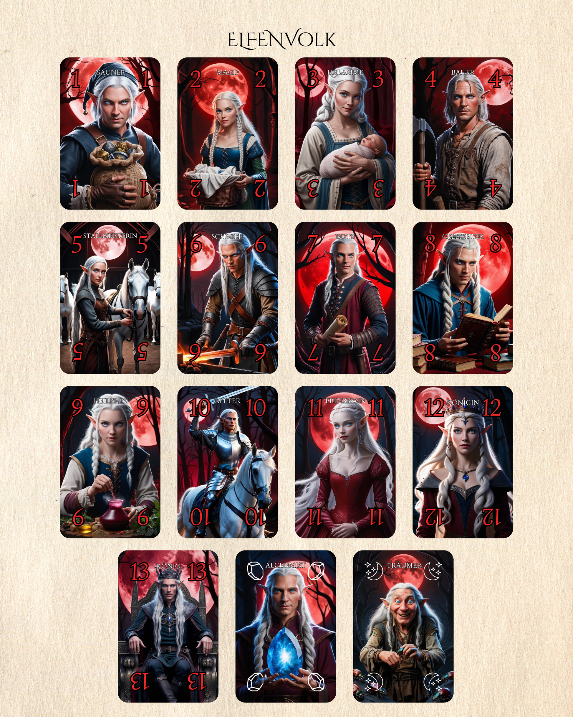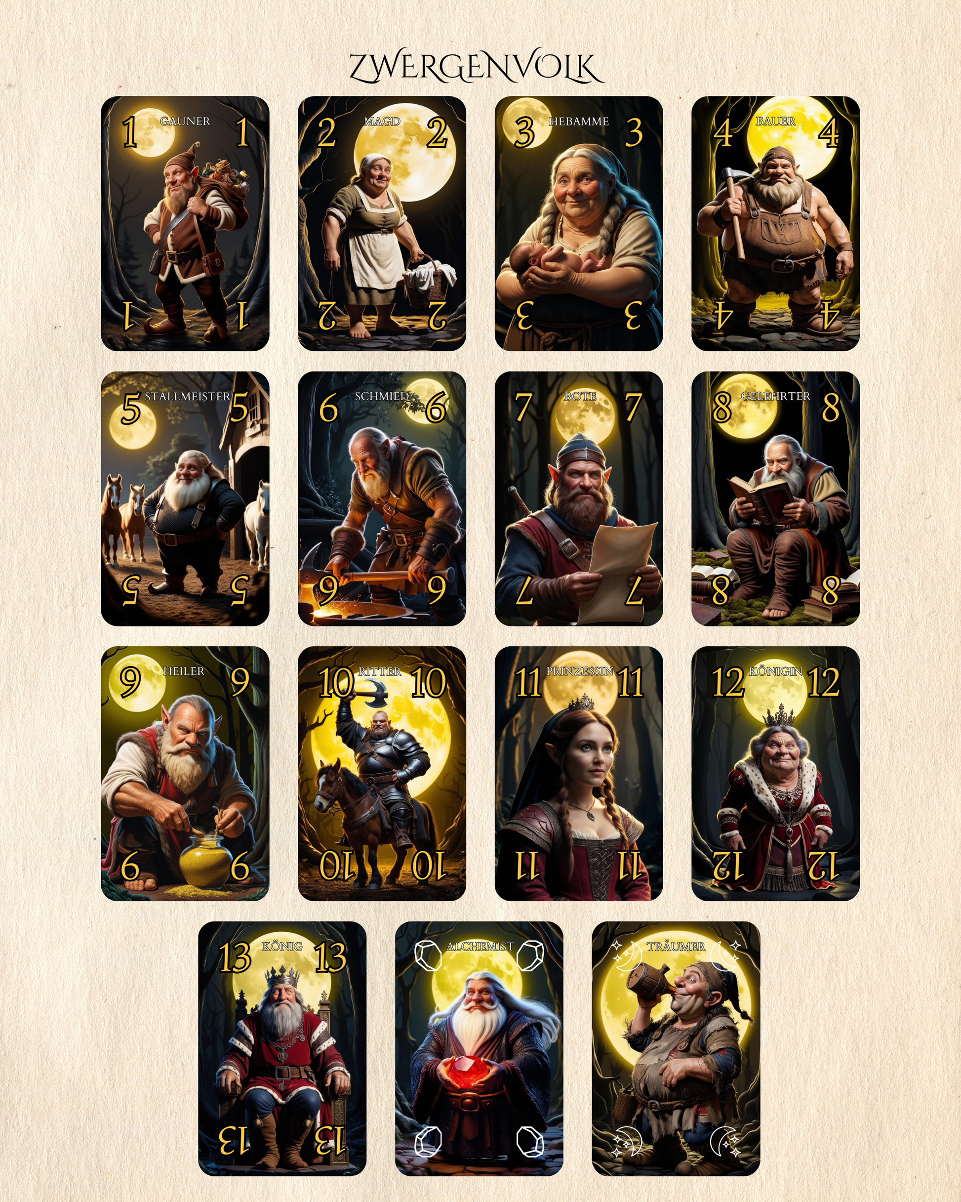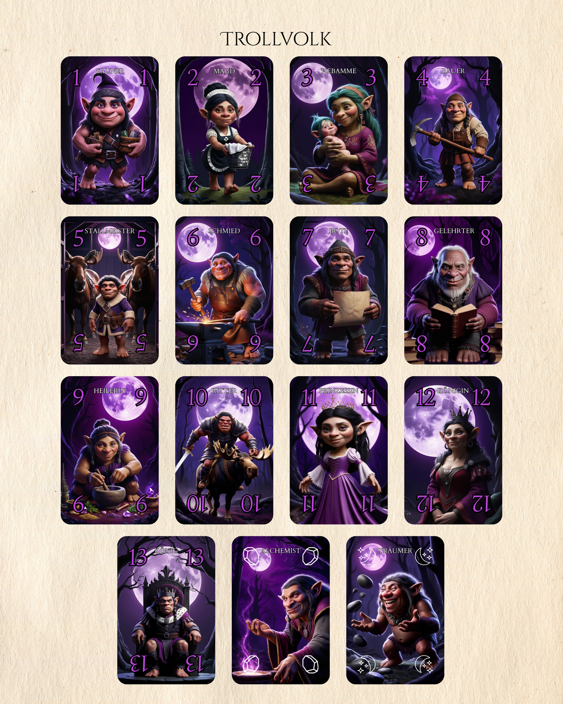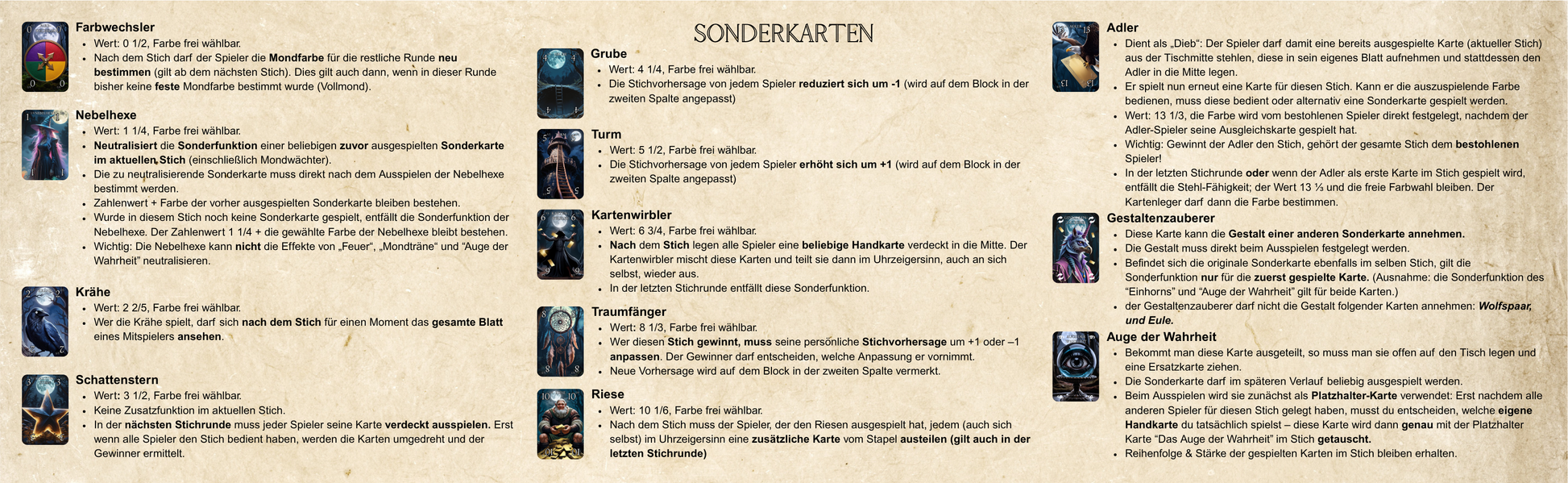 Mit 24 mächtigen Sonderkarten – gestaltet mit Liebe zum Detail und inspiriert von alten Legenden – entfesselst du Mondwächter, starke Mächte und überraschende Wendungen. Jede Partie fordert Mut, Taktik und ein Gespür für dein Schicksal: Wie viele Stiche wirst du holen?