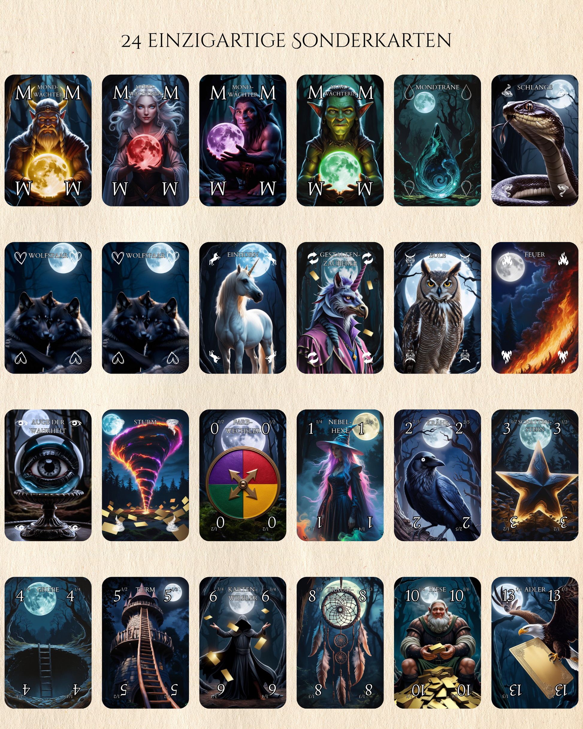 - 24 exklusiven Sonderkarten davon 4 mächtige Mondwächter